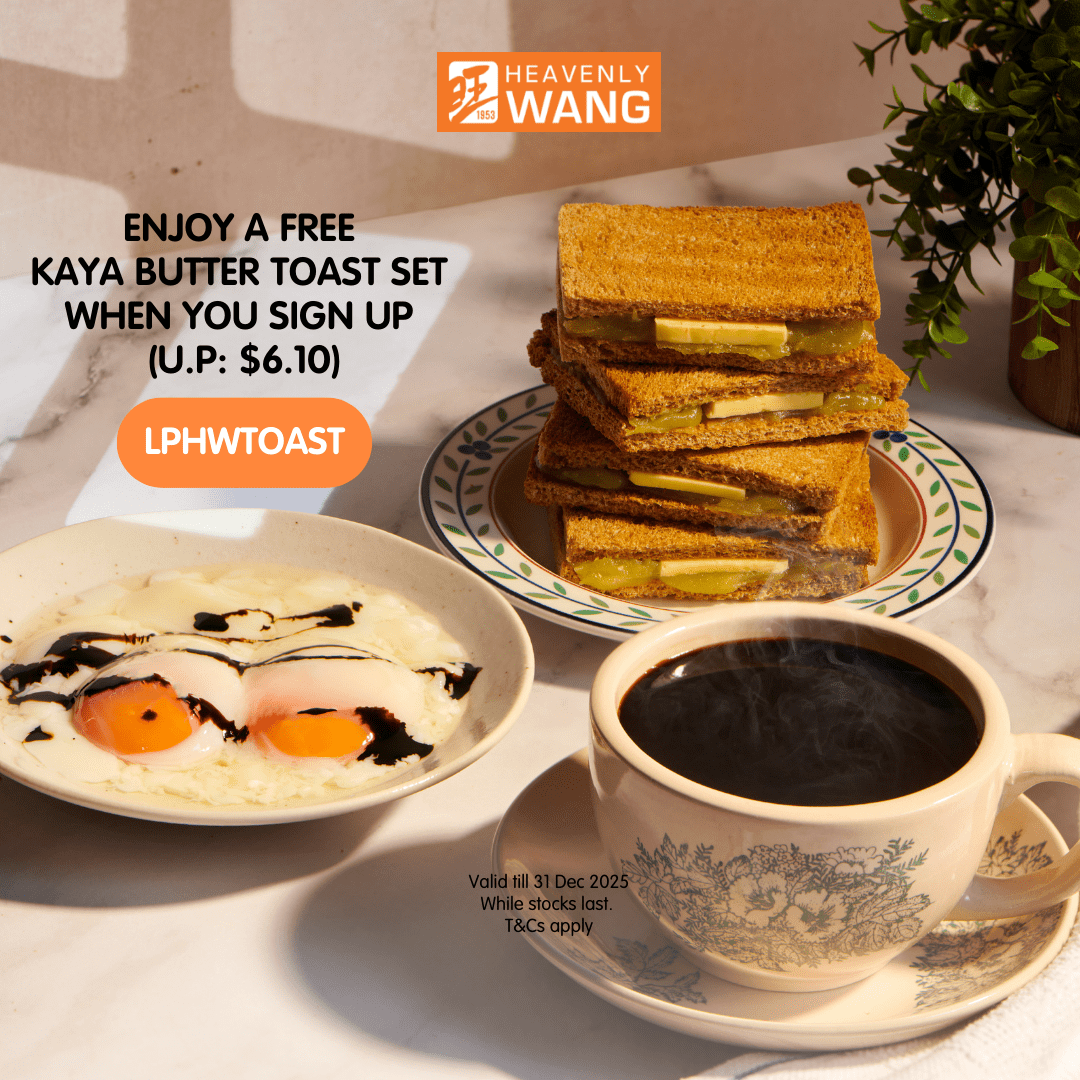 Enjoy a free Kaya Butter Toast Set (U.P: $6.10) when you sign up with promo code LPHWTOAST.