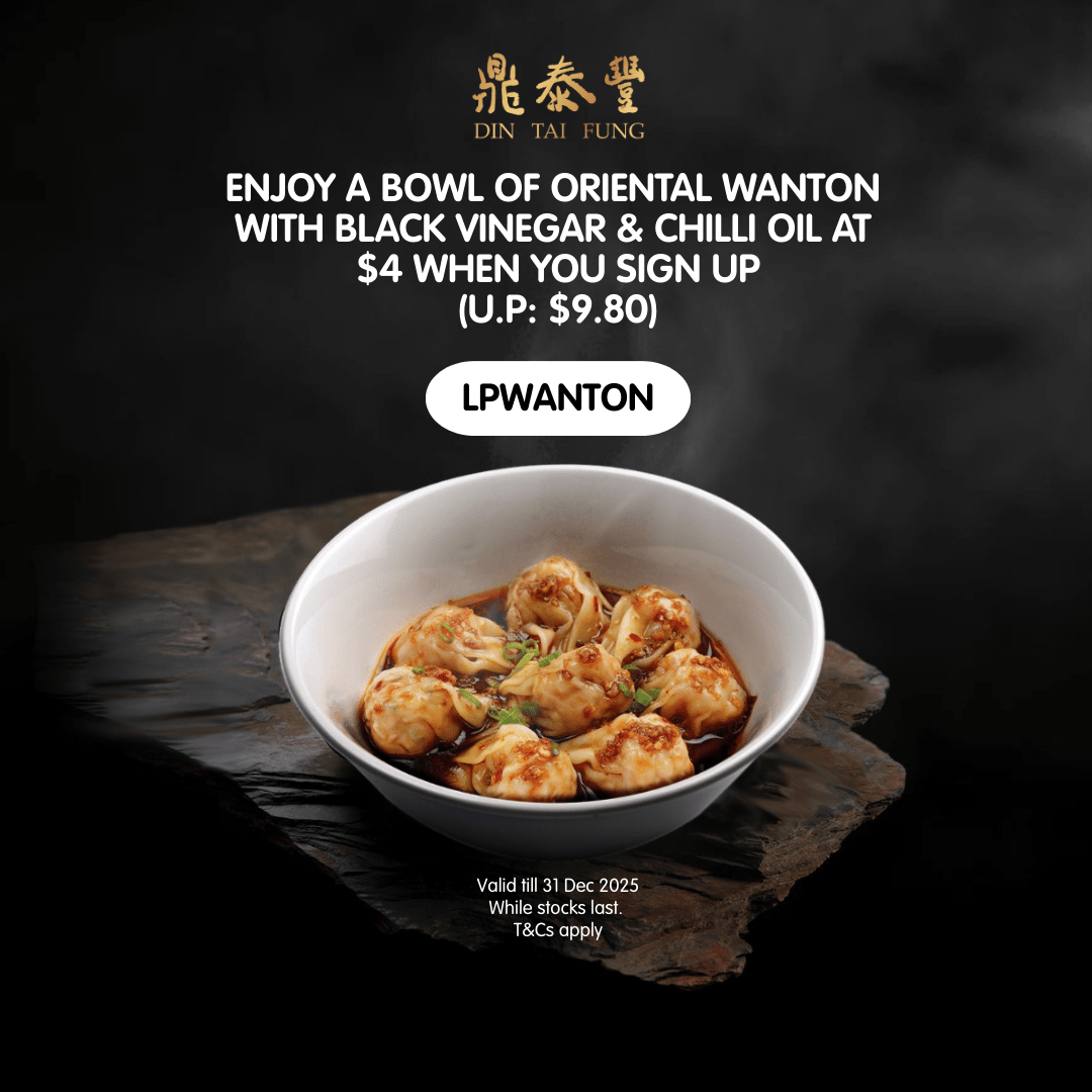 Enjoy a bowl of Oriental Wanton with Black Vinegar and Chili Oil at $4 (U.P: $9.80) when you sign up with promo code LPWANTON